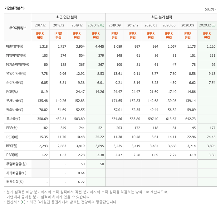 매출액 : 2017년 1318억원, 2018년 1757억원, 2019년 3904억원으로 증가하고 있습니다. 2020년 3분기까지는 2907억원으로 전년동기 10.9% 증가하였습니다. 2020년 분기별로 보면, 1분기 984억원, 2분기 1067억원, 3분기 1175억원입니다.