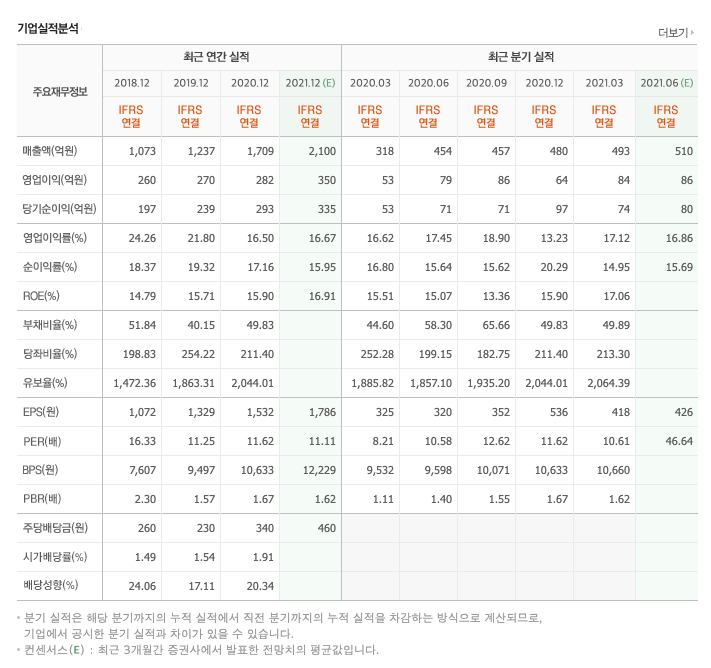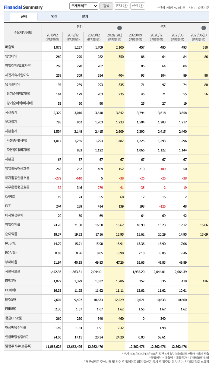 영업이익 : 2018년 260억원, 2019년 270억원, 2020년 282억원으로 증가하였고, 2020년 1분기 84억원으로 전년동기대비 증가하였습니다. 2021년 1분기는 전년동기대비 59.5% 증가하였습니다. 2020년 분기별로 보면 2분기 79억원, 3분기 86억원, 4분기 64억원입니다.