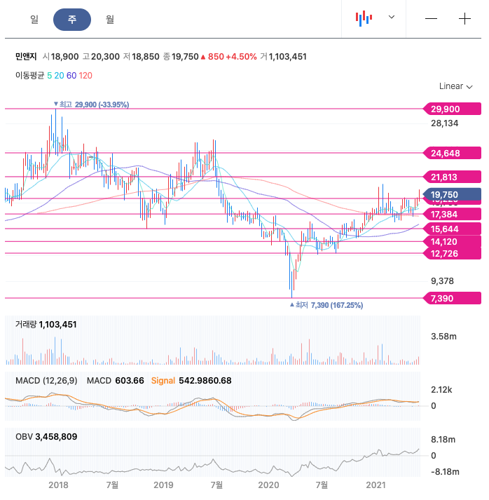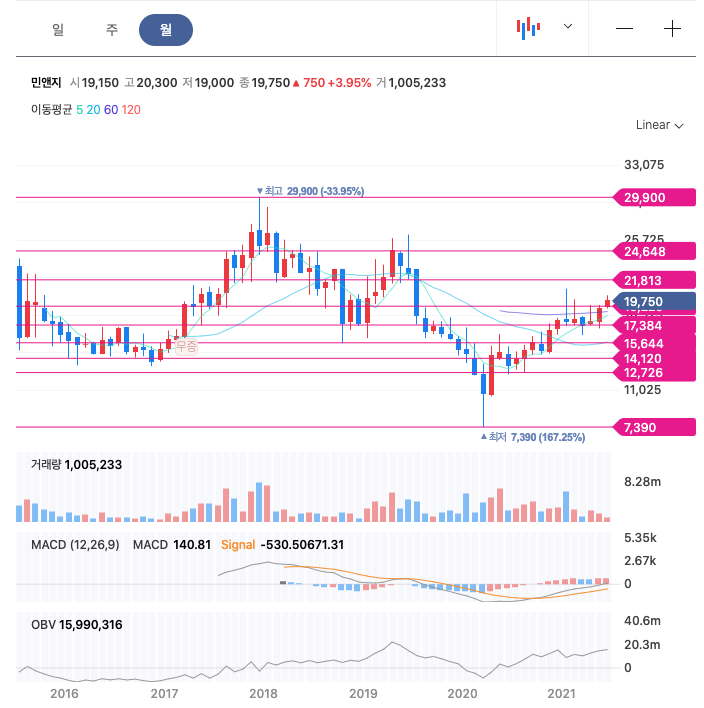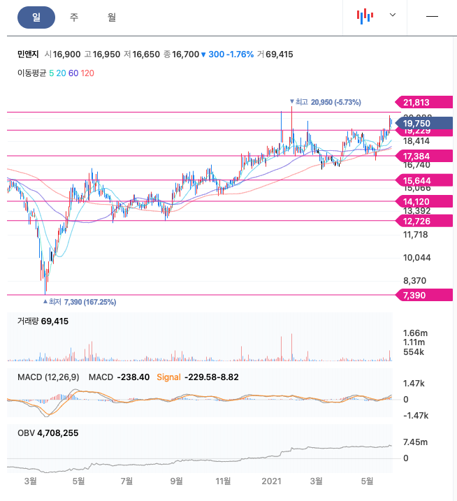 민앤지는 20년 8월부터 우상향하여 꾸준히 증가하다가 21년 1월에 최고 20,950원을 찍고 조정을 받은 뒤다시 증가하고 있습니다.