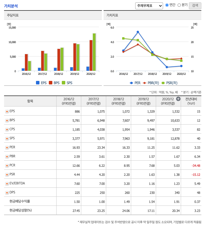 현금배당수익률(최근1년간 배당금 합계를 전일 보통주 주가로 나눈값) : 2016년 1.5배, 2017년 1배로 감소, 2018년 1.49배로 증가, 2019년 1.54배로 증가, 2020년 1.91배으로 증가하였습니다.