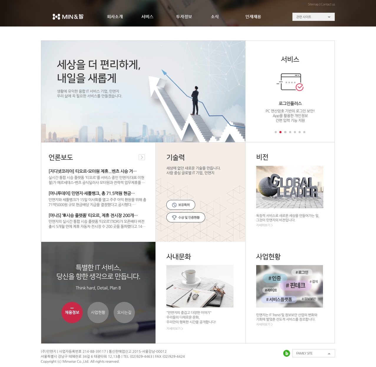 당신이 꼭 찾던IT 서비스 우리가 원하던 IT 서비스 세상이 민앤지의 독창적 사고방식으로 시작됩니다. 세상을 더 편리하게,내일을 새롭게 생활에 유익한 융합 IT 서비스 기업, 민앤지 우리 삶에
