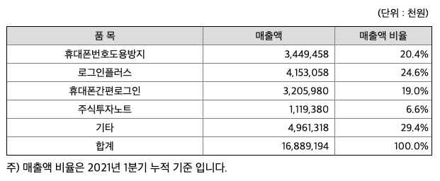 당사는 개인정보보안 중심의 2차 본인인증 및 보안서비스와 다양한 생활서비스를 개발 및 운영하는 것을 주된 사업으로 하고 있으며 이동통신사 부가서비스 형태로 주된 매출이 발생합니다. 2009년 휴대폰번호도용방지 서비스를 시작으로 로그인플러스, 휴대폰간편로그인 등의 다양한 2차 본인인증 및 보안서비스를 제공하고 있으며 주식투자노트, 건강지키미, 세이프캐시, 내정보지키미 등을 서비스하며 생활 플랫폼으로 사업영역을 확대하고 있습니다. 특히 시장 개척 역량, 서비스 개발 역량, 가입자 기반의 인프라 등을 바탕으로 다양한 IT서비스에 대한 퍼블리싱 사업과 1차 본인인증 운영까지 사업영역을 확대하는 것은 물론 강력한 마케팅 역량을 바탕으로 독점적인 IT서비스 비즈니스 플랫폼을 구축하고 있습니다.