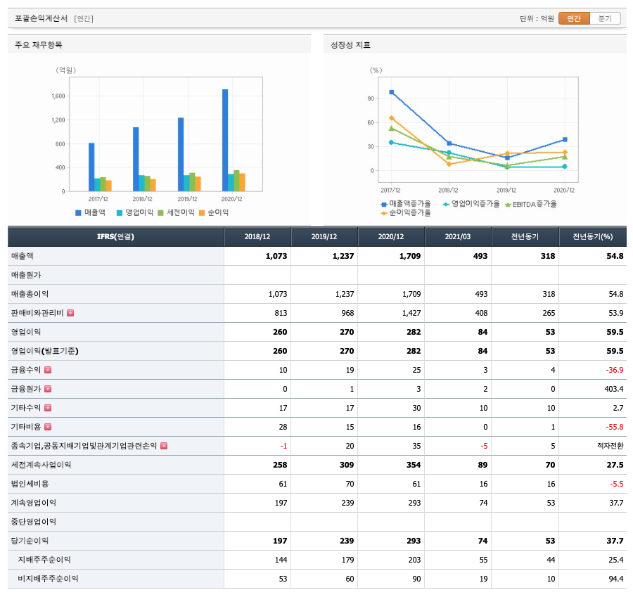 매출액 : 2018년 1073억원, 2019년 1237억원, 2020년 1709억원으로 증가하였고, 2021년 1분기 493억원으로 전년동기대비 증가하였습니다. 2021년 1분기는 전년동기대비 54.8% 증가하였습니다. 2020년 분기별로 보면 2분기 454억원, 3분기 457억원, 4분기 480억원입니다.