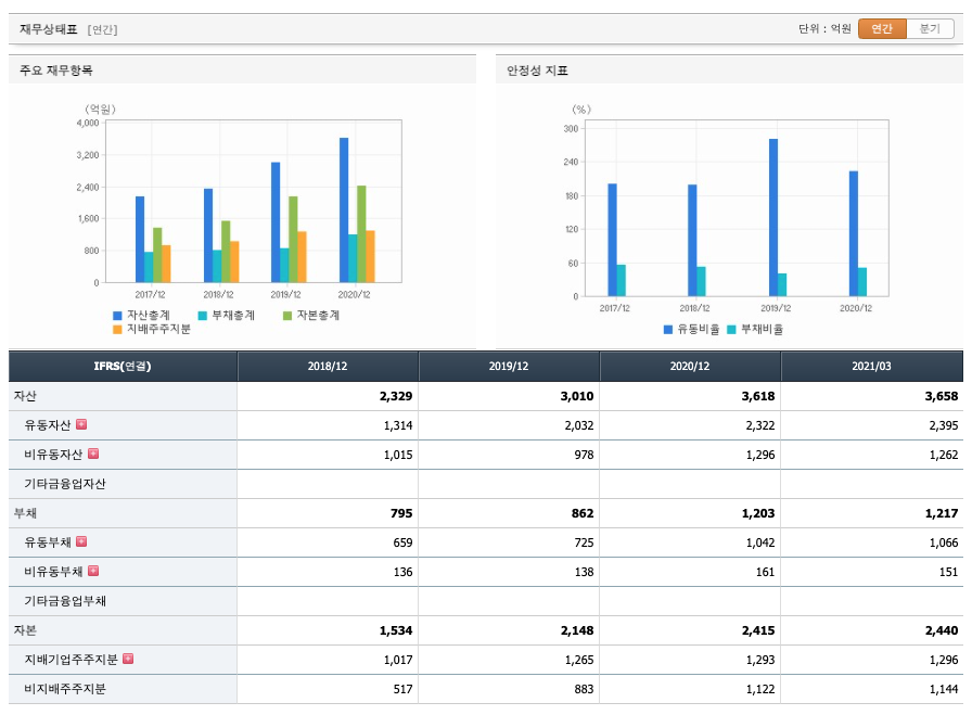 자산은 2018년 2329억원, 2019년 3010억원, 2020년 3618억원, 2021년 1분기 3658억원으로 증가하였습니다.