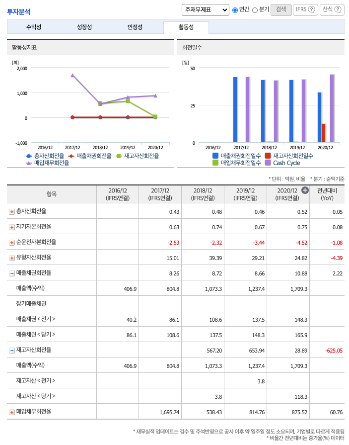 매출채권회전율 : 2018년 약 137억원, 2019년 약 148억원, 2020년 약 165억원이고, 회전율은 2018년 약 8회, 2019년 약 8회, 2020년 약 10회로 안정적입니다.