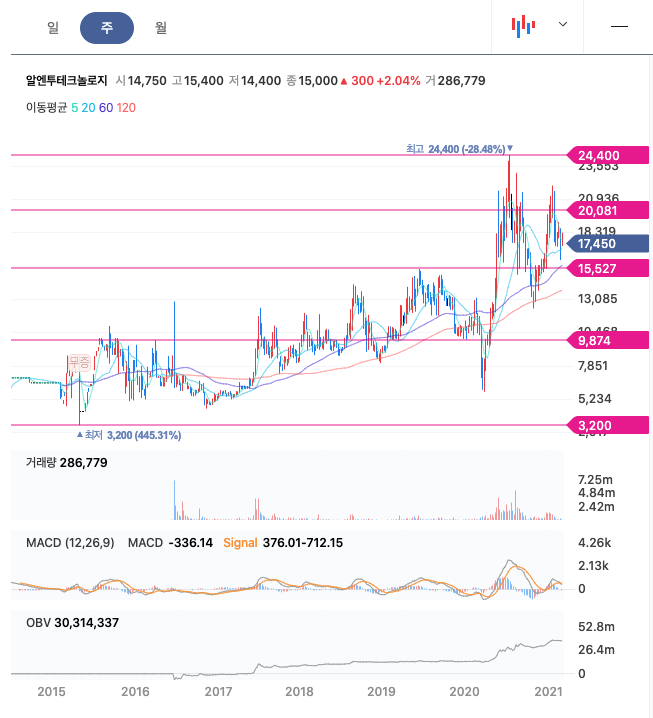 **매매포인트 : 알엔투테크놀로지는 2020년 12월 급등하여 1차 저지선을 17000원으로 상향되었습니다. 이후 22000원까지 올랐다가 조정받고 있습니다. 1차 저항선을 20000원으로 보고 있습니다. 매수는 17000원초반이 적당해 보입니다.