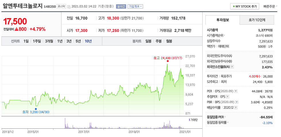 알엔투테크놀로지의 2020년 영업이익은 약 40억원으로 추정됩니다. 현재(21. 3. 2) 시가총액은 1277억원으로 멀티플31입니다.