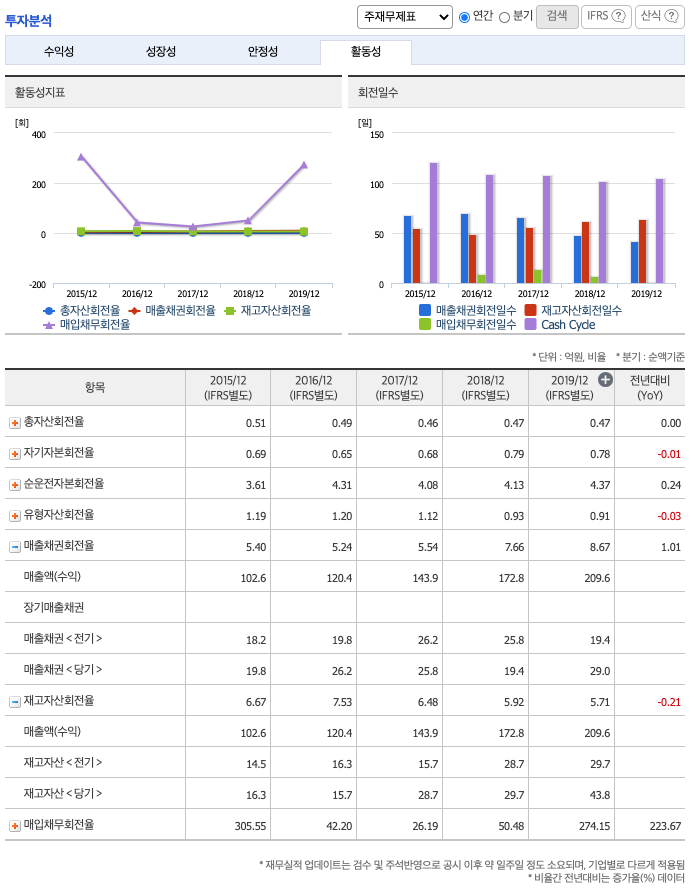 유보율 : 2017년 577%, 2018년 598%, 2019년 800%로 증가하고 있습니다. 유보율은 다소 낮아 유동자산이 높지 않습니다.