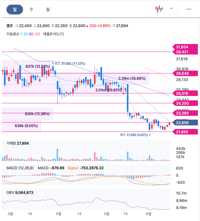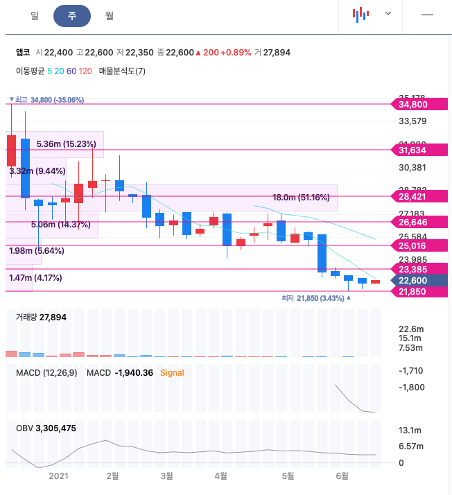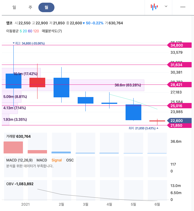 앱코는 20년 12월 최고 34,800원을 찍고, 조정을 받으며 주가가 지속적으로 하향하였습니다.