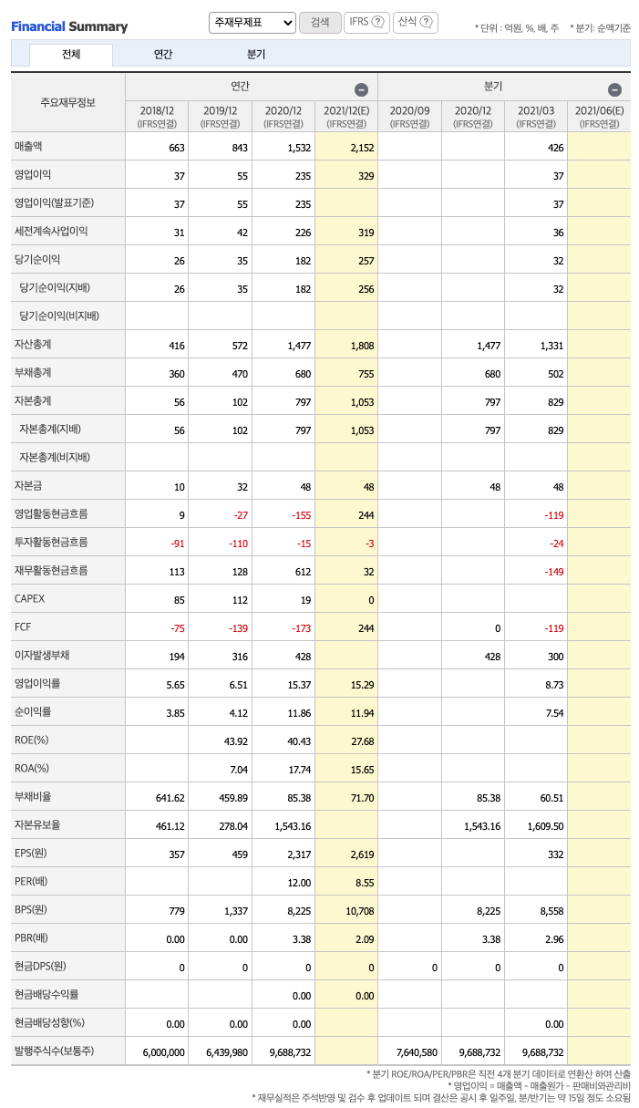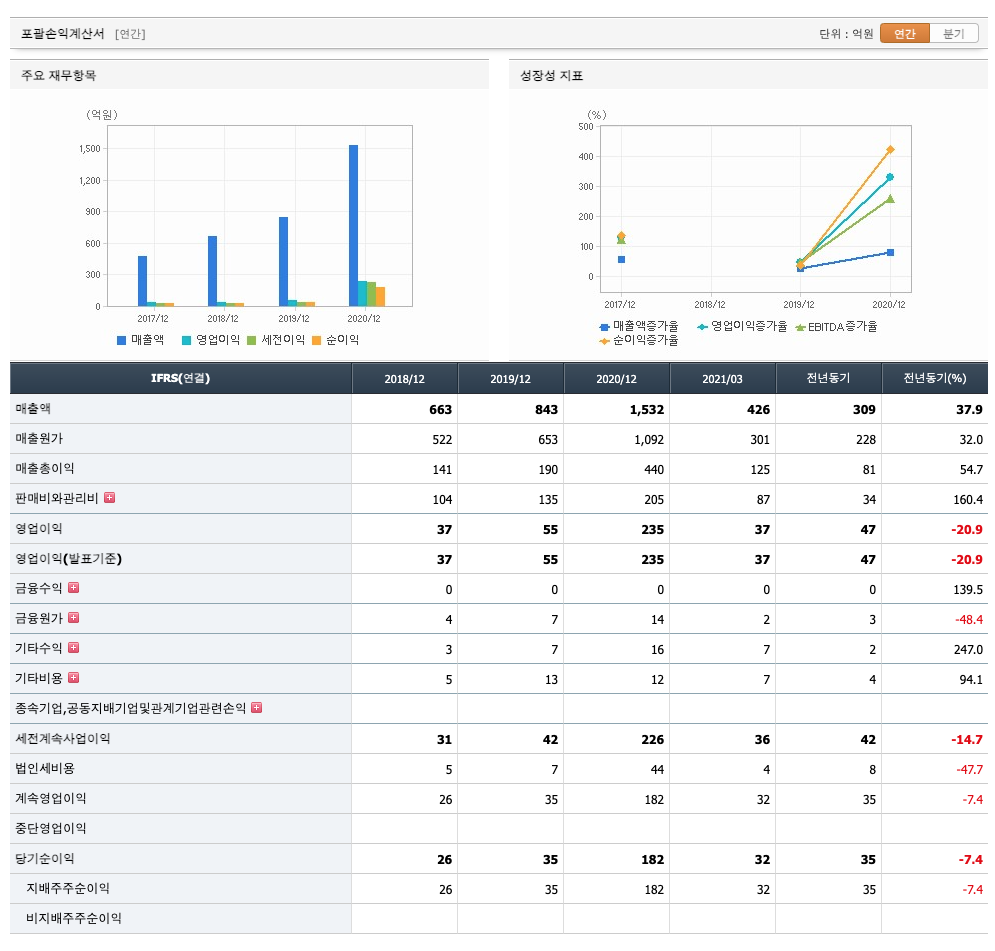 매출액 : 2018년 663억원, 2019년 843억원, 2020년 1532억원으로 증가, 2021년 1분기 426억원으로 전년동기대비 증가하였습니다. 2021년 1분기는 전년동기대비 37.9% 증가하였습니다.