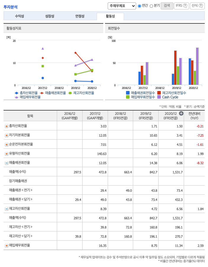 재고자산회전율 : 2018년 약 160억원, 2019년 약 196억원, 2020년 약 270억원이고, 회전율은 2019년 약 4회, 2020년 약 6회로 안정적입니다.