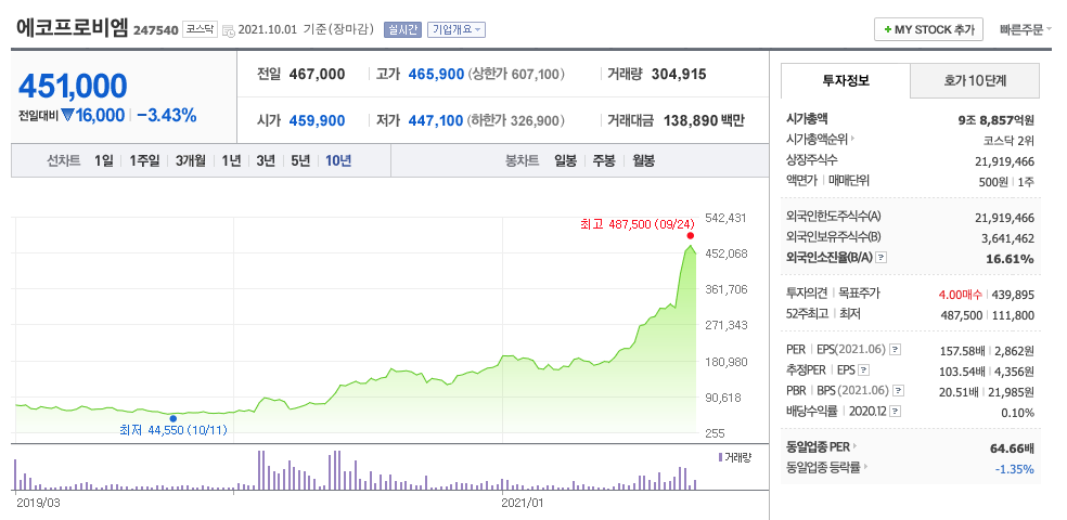 에코브로비엠은 21년 6월부터 주가가 오르기 시작하였고, 21년 9월에 급등하여 최고 487,500원을 찍고 조정중에 있습니다.