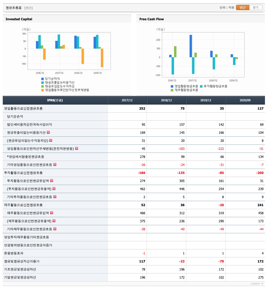 영업활동 현금흐름 : 2017년 252억원, 2018년 75억원, 2019년 35억원이고, 2020년 3분기까지 127억원으로 영업활동 현금흐름이 좋습니다.