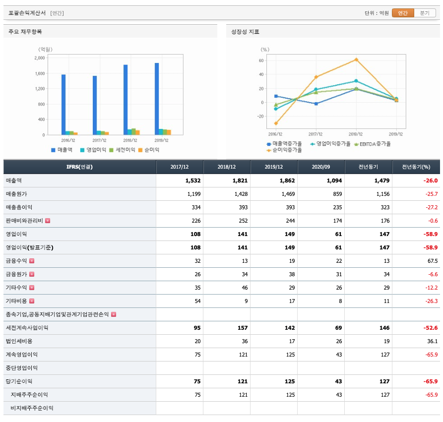 매출액 : 2017년 1532억원, 2018년 1821억원, 2019년 1862억원으로 증가하였고, 2020년 3분기까지 1094억원으로 전년동기 -26% 감소하였습니다. 2020년 분기별로 보면 1분기 342억원, 2분기 333억원, 3분기 418억원입니다.