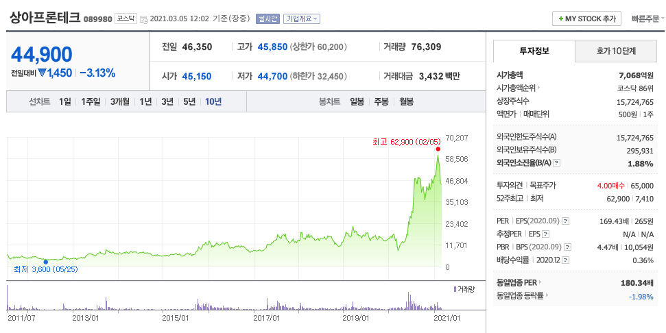 상아프론테크의 2020년 영업이익은 98억원으로 추정됩니다. 현재(21.3.5) 시가총액은 7131억원으로 멀티플72입니다.