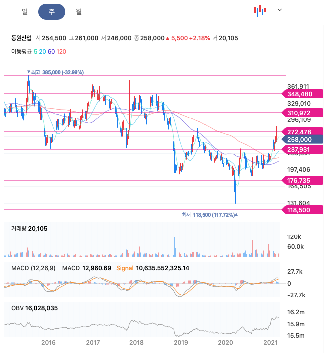 **매매포인트 : 동원산업은 21년 1월에 급등하여 2월에 전고점인 283,500원을 찍고, 조정을 받고 있습니다. 매수 적정가는 240,000원초반입니다.