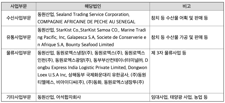 당사와 종속회사는 원양어업, 수산물 가공 및 판매업, 물류업 등을 영위하고 있습니다. 당사 및 종속회사의 사업부문 현황을 요약하면 아래와 같습니다.