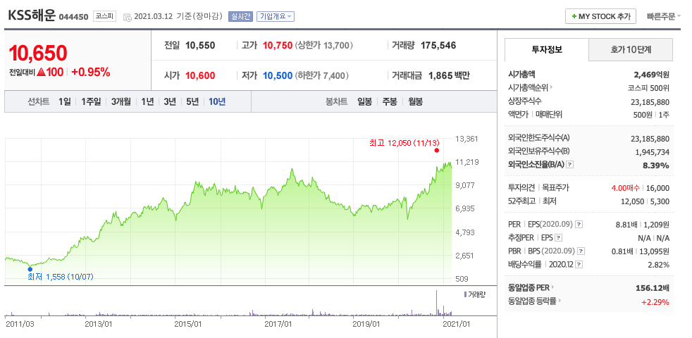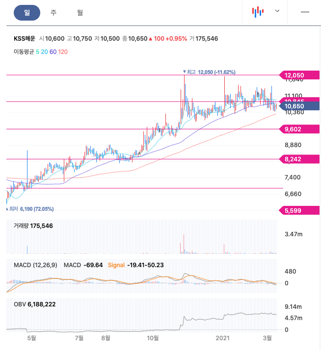 ***매매포인트 : KSS해운은 20년 11월에 급등하여 1차 저지선 10,000원과 1차 저항선 12,000원사이에서 증감을 오가고 있습니다. 매수 적정가는 9000원초반입니다.