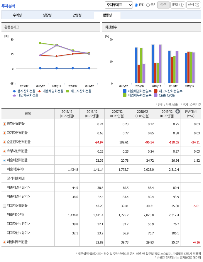 재고자산회전율 : 2017년 56억원, 2018년 76억원, 2019년 106억원이고, 회전율은 2017년 39회, 2018년 30회, 2019년 25회로 감소하고 있으나 안정적입니다.