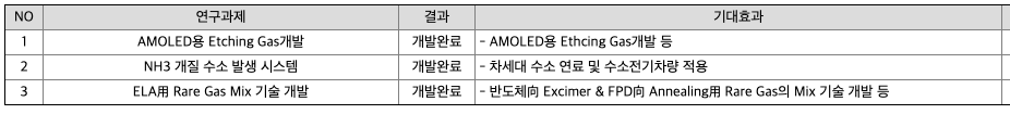 원익머트리얼즈는 2003년 PH3 혼합가스를 비롯한 수종의 반도체 공정용 특수가스를 국산화하여 삼성전자 및 SK하이닉스를 비롯한 국내 대부분의 반도체 회사에 공급 개시를 필두로, 그간 수입에 의존하던 제품들을 원익머트리얼즈의 독자적인 기술개발을 통해 점차적으로 국산화에 성공함은 물론 반도체 산업의 원가절감을 통한 국가 경쟁력 향상에 지속적으로 기여한 바 크다고 할 수 있습니다. 기존의 DRAM 및 2D NAND Flash용 특수가스 공급기반을 바탕으로 최근 3D NAND 양산투자 확대에 따라 공급물량이 증대하고 있으며 반도체 이외에도 삼성디스플레이에 N2O, NH3를 비롯한 10여종의 공정용 특수가스를 AMOLED 개발 초기부터 공급개시하여 현재까지 안정적인 공급과 높은 M/S를 확보하고 있습니다.
