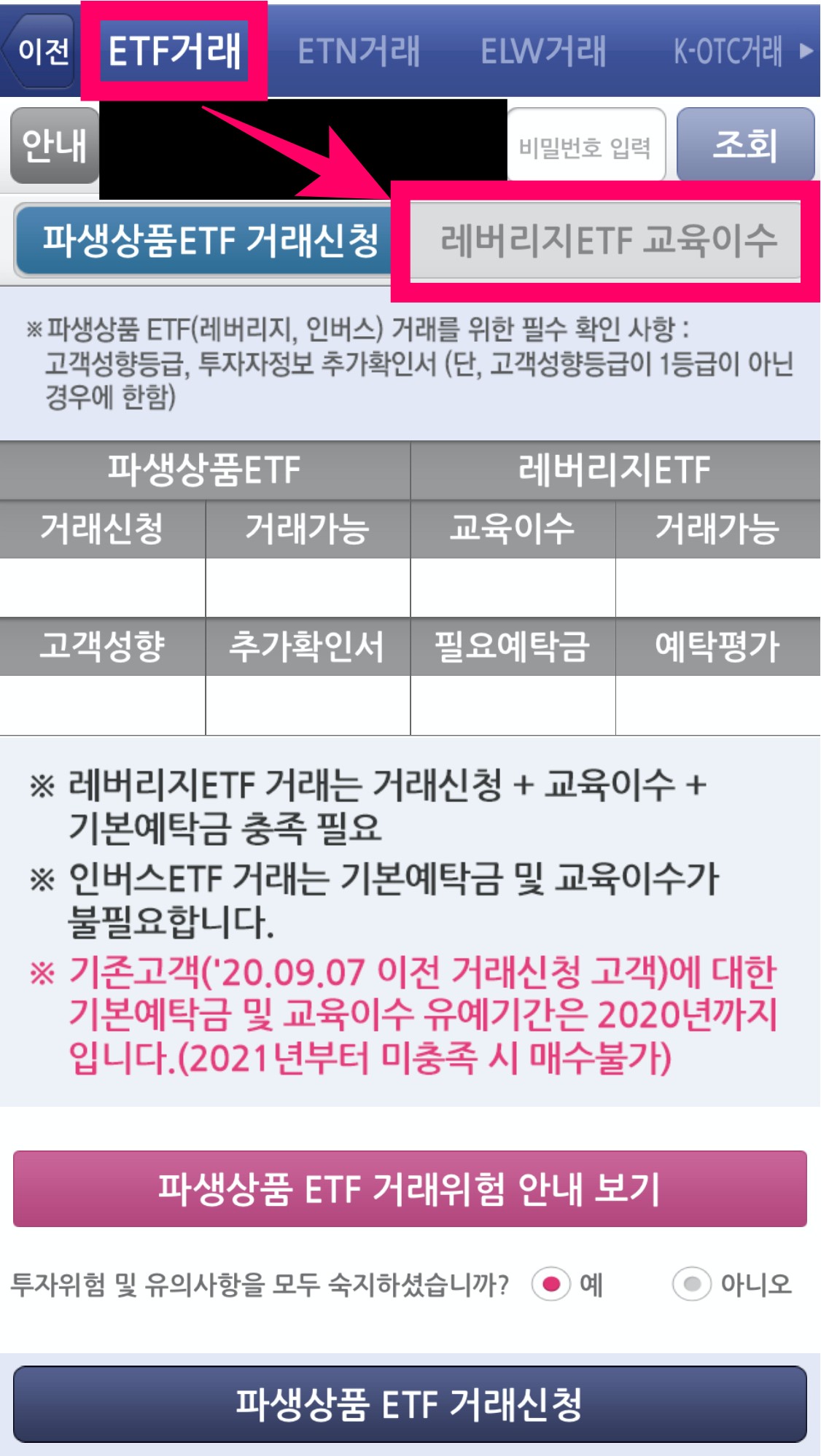 3. "ETF거래"를 클릭한 뒤, "레버리지ETF교육이수"를 클릭합니다.