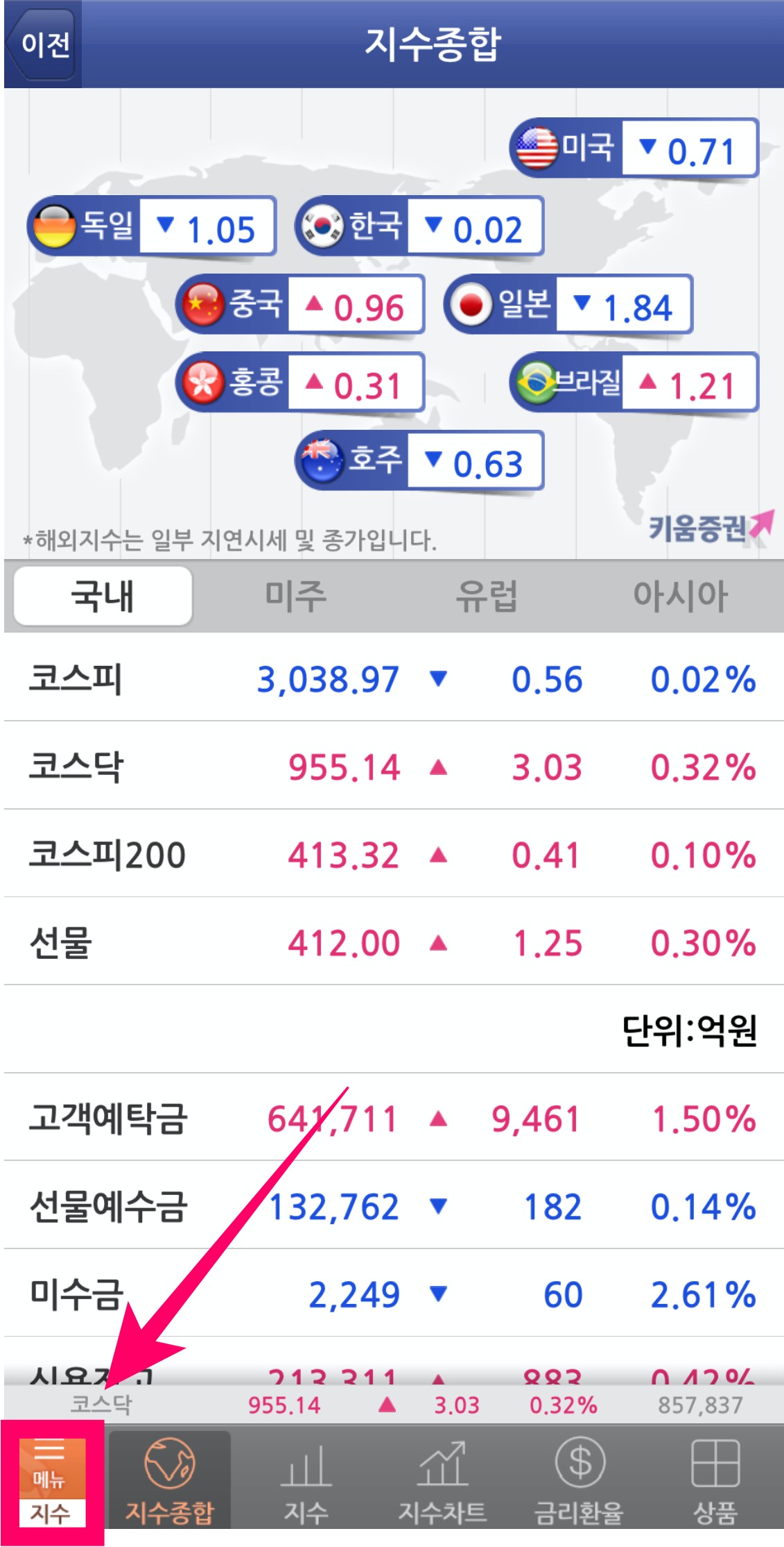 1. 키움증권 영웅문S앱에서 우측 하단의 "메뉴"를 클릭합니다