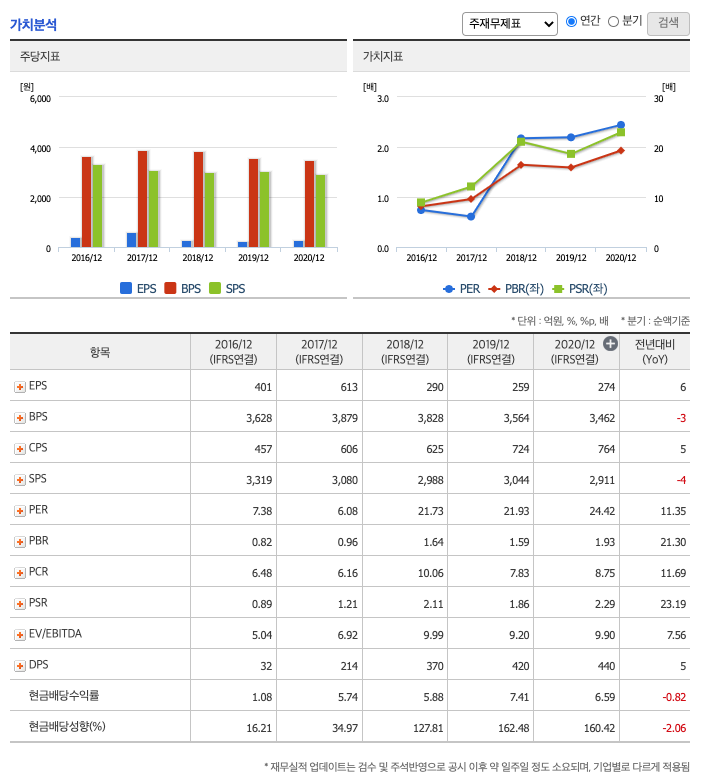 현금배당수익률(최근1년간 배당금 합계를 전일 보통주 주가로 나눈값) : 2016년 1.08배, 2017년 5.74배, 2018년 5.88배, 2019년 7.41배, 2020년 6.59배으로 감소하였습니다.