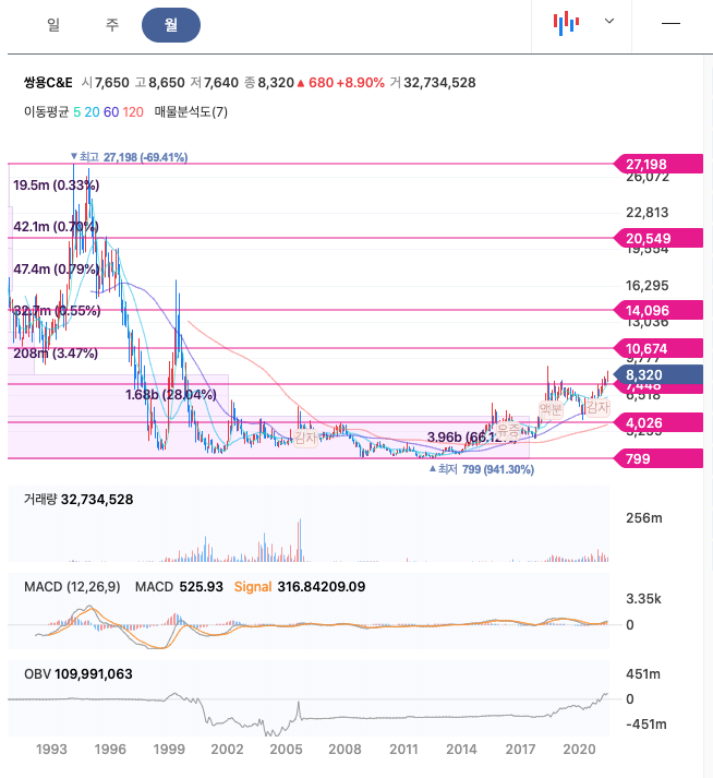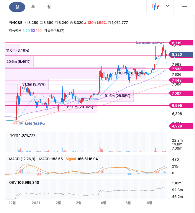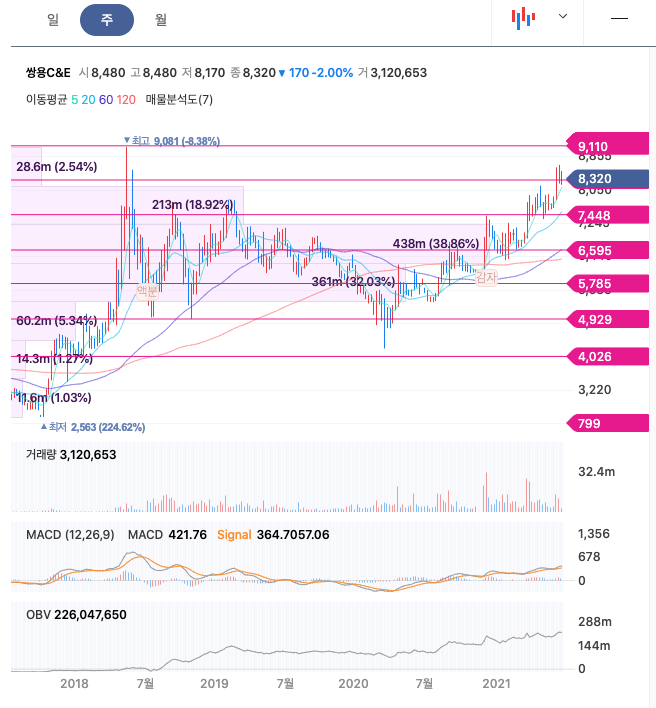 쌍용C&E는 20년 12월 감자 이후 주가가 급등한 이후 지속적으로 우상향하여 21년 6월 최고 8650원을 찍고 조정을 받고 있습니다.