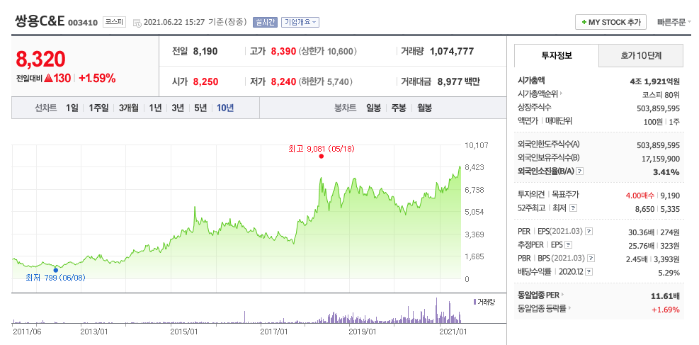 | 쌍용C&E | 8320원 | 7770원 | 7745원 | 7812원 |