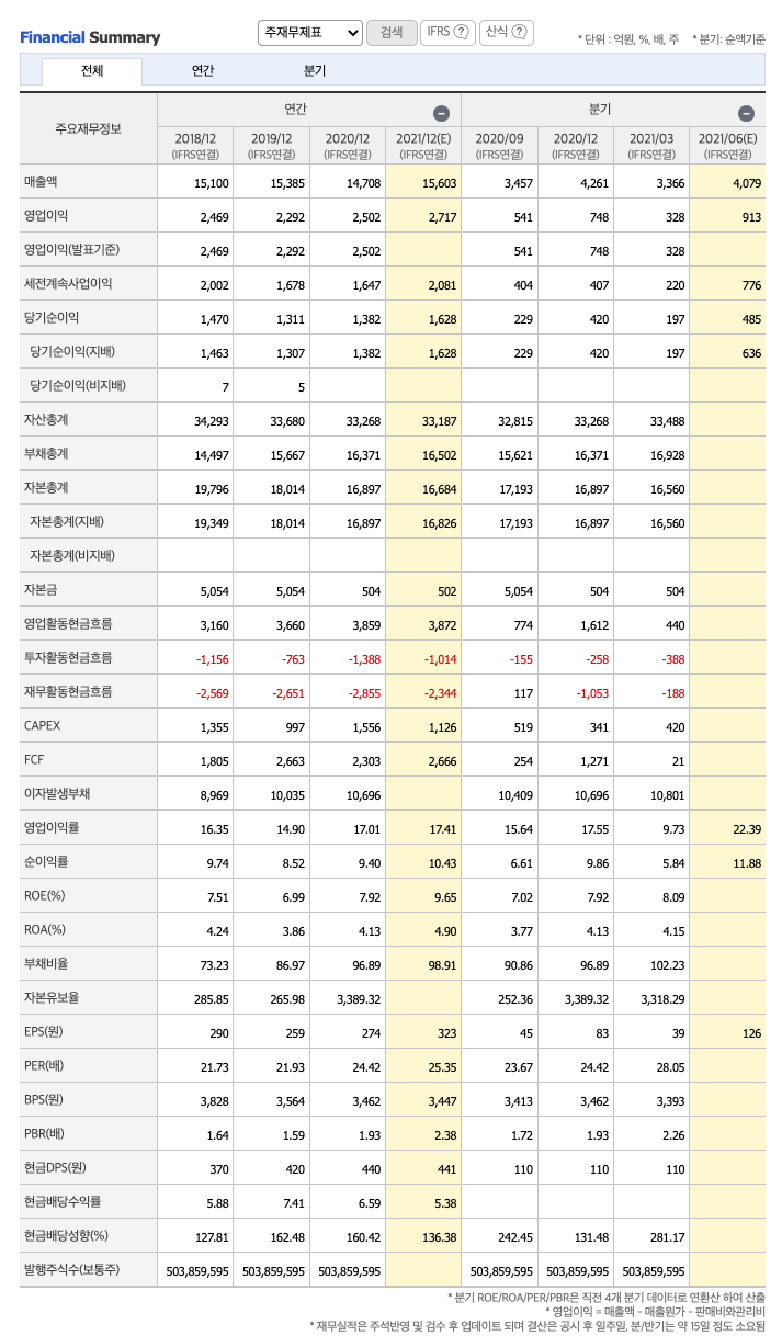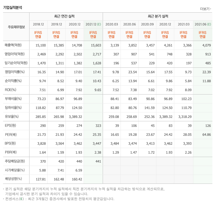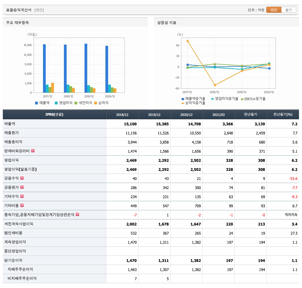 매출액 : 2018년 15,100억원, 2019년 15,385억원으로 증가, 2020년 14,708억원으로 감소, 2021년 1분기 3366억원으로 전년동기대비 증가하였습니다. 2021년 1분기는 전년동기대비 7.2% 증가하였습니다. 2020년 분기별로 보면 2분기 3852억원, 3분기 3457억원, 4분기 4261억원입니다.