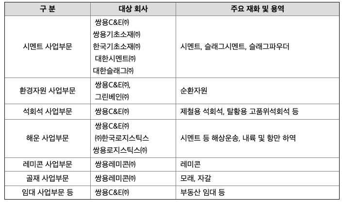 5) 경쟁우위 요소 : 2017년 4월 25일을 합병기준일로 하여 지배회사에 합병된 종속회사 쌍용해운㈜는 과거 해운 조선업 호황으로 선박가격이 높을 때는 노후 시멘트선의 대체선박을 확보하지 못하여 어려움을 겪었으나, 2000년대 후반에 최신형 시멘트선 3척을 낮은 가격으로 도입함으로써 시멘트 선대를 안정적으로 유지하여 지배회사인 쌍용C&E㈜에 경쟁력 있는 해운서비스를 제공할 수 있게 되었습니다. 하역사업부문도 지속적으로 사업영역을 확장하고 시설과 장비를 보완하여 향후에도 안정적으로 수익을 창출할 수 있도록 대비하였습니다. 합병 이후 당사는 현재 11척의 시멘트전용선 선대를 유지 중이며, 오랜기간의 시멘트전용선 운영 Know-how를 바탕으로 연안 출하공장으로의 해송을 안정적으로 제공하고 있습니다. 또한 7만톤급 Panamax Bulk 선박을 활용해 러시아, 호주, 인도네시아, 태국 등에서 수입하는 석탄, 천연석고 등을 국내 우량 화주들에게 수송하고 있습니다. 하역사업부문은 2016.12.23.자로 쌍용로지스틱스㈜에 영업 양도를 하여 하역부문의 영업은 중단된 상태이며, 쌍용로지스틱스㈜가 하역사업을 영위하고 있습니다. 쌍용로지스틱스㈜는 지배회사의 주생산품인 벌크시멘트 및 클링커의 선적, 유연탄, 부원료 등의 항만하역과 운송주선 등의 사업을 영위하고 있습니다. 또한 종속회사인 ㈜현진케이에스는 2016.9.30.자로 ㈜한국로지스틱스에 영업양도를 하였고, 2016.11.22.자로 쌍용해운㈜와 합병하였습니다. 종속회사인 ㈜한국로지스틱스는 지배회사의 또다른 종속회사인 쌍용기초소재㈜와 한국기초소재㈜에서 생산하는 슬래그 제품 원료인 수재 슬래그를 광양 및 당진에서 선적하여 인천, 군산으로 수송하는 업무를 담당하고 있습니다. 동사가 보유하고 있는 바지선은 국내에서 사용중인 일반적인 바지선보다 큰 규모로써 그 희소성으로 인한 경쟁력을 보유하고 있으며 운항효율의 안정성도 높은 편입니다.