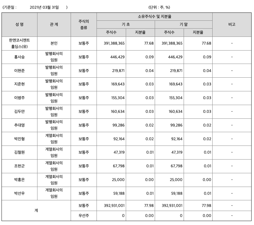 4) 시장여건 : 국내 시멘트 산업은 1980년대 후반 공급부족 상황을 해소하기 위해 적극적으로 생산능력을 확대하기 시작하여 1997년까지 생산능력을 6,200만톤 수준까지 확충하였으며, 시멘트 수요는 IMF외환위기 이후 지속적으로 감소하여 공급이 수요를 초과하는 상황입니다. 시멘트 산업은 업체간 품질이나 생산기술상의 차별성이 뚜렷하지 않아 제조원가나 물류비용의 절감을 통한 원가경쟁력이 주된 경쟁요소로 작용합니다. 또한 시멘트 산업은 대규모의 설비투자가 요구되는 자본집약적 장치산업이며, 소비지인 대도시 인근에물류기지를 확보하여야 하므로 타 산업에 비해 상대적으로 진입장벽이 높은 산업입니다. 지배회사는 국내 시멘트 시장에서 매년 평균 20% 이상의 점유율을 기록하고 있습니다.
