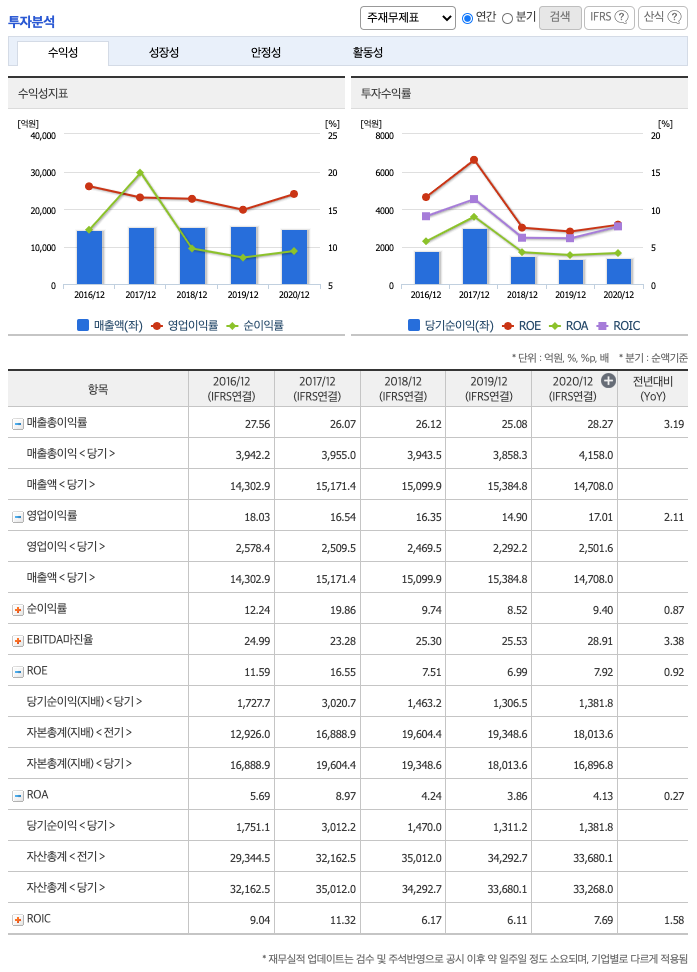 ROE(Return On Equity, 자기자본순이익율, 주주의 관점) : 2016년 약 11%, 2017년 약 16%으로 증가, 2018년 약 7%으로 감소, 2019년 약 6%, 2020년 약 7%으로 증가하였고, 자기자본순이익율은 이상율(10%)보다 낮습니다.