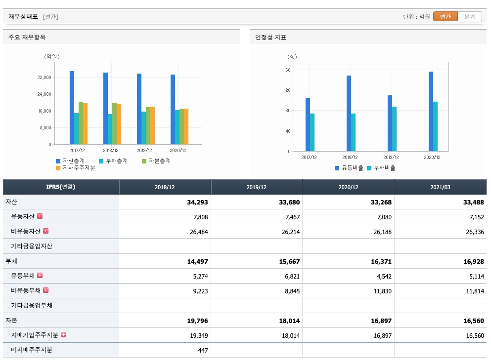 자산은 2018년 34,293억원, 2019년 33,680억원, 2020년 33,268억원으로 감소, 2021년 1분기 33,488억원으로 증가하였습니다.