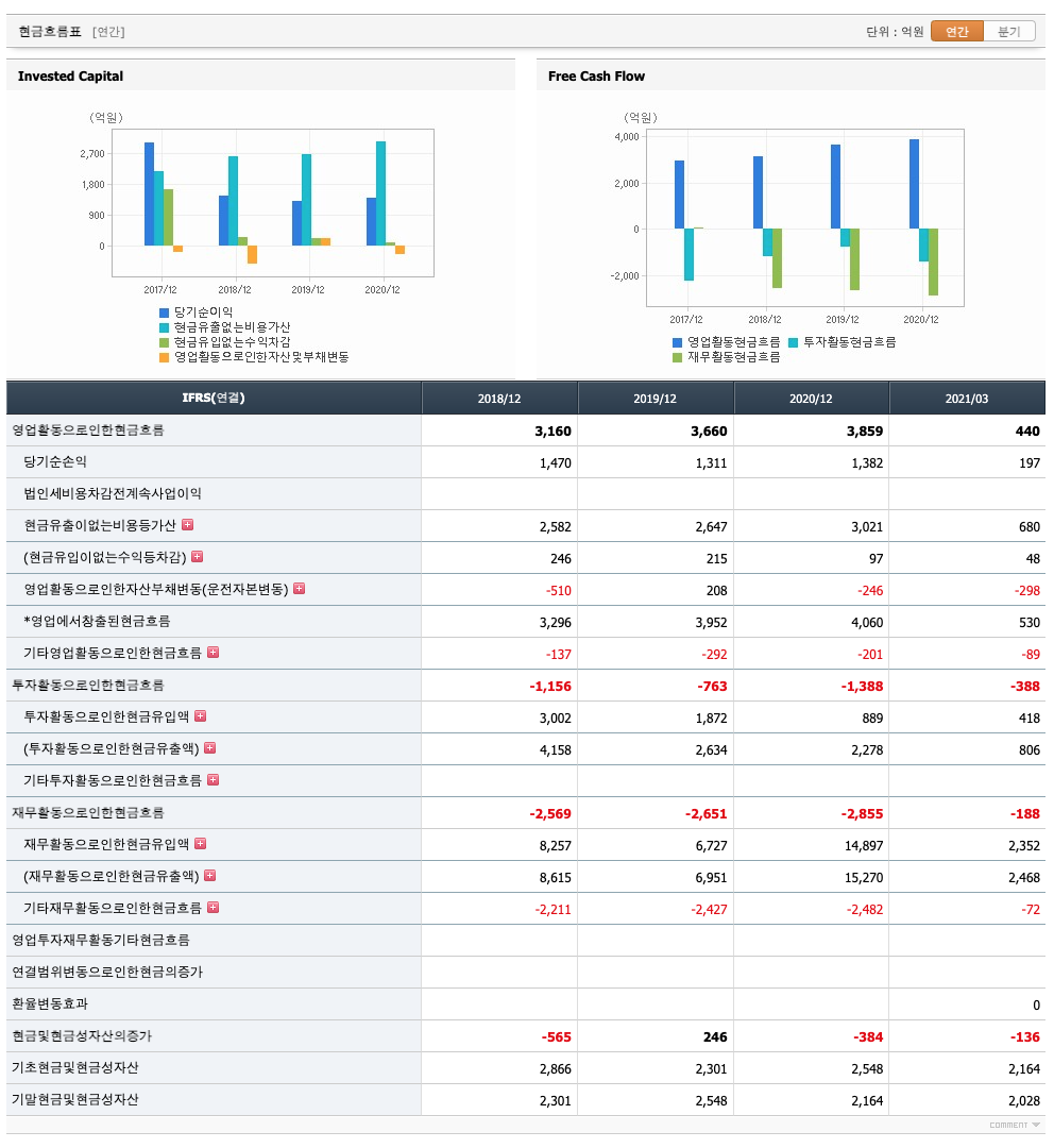 재무활동 현금흐름 : 2018년 -2569억원, 2019년 -2651억원, 2020년 -2855억원, 2021년 1분기 -188억원으로 재무활동 현금흐름이 마이너스로 원활합니다.