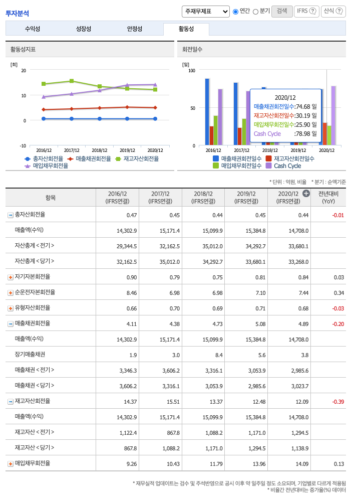 **매출채권회전일수(=돈을 받는 순환일 수) 약 74일, 재고자산회전일수(=재고자산 빠지는 일수) 약 30일, 매일채무회전일수(=돈을 늦게 줘도 되는 일 수) 약 25일이고, Cash Cycle(현금회전율) 약 78일로 현금운영은 다소 안정적이지 못합니다.