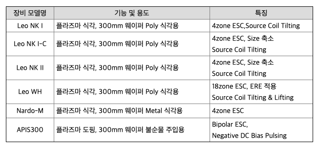 당사는 반도체 제조 전공정 장비인 건식 식각장비(Dry Etcher) 제조업체로서 관련한 원천기술을 다수 보유하고 있습니다. 특히 당사가 보유하고 있는 플라즈마 소스는현재 200mm와 300mm 웨이퍼용 반도체 건식 식각장비의 원천기술로 적용되어 성능 및 가격 경쟁력을 보여주며 외산장비를 대체하고 있습니다. 또한 본 원천기술은 반도체 제조공정인 화학기상증착(Chemical Vapor Deposition, CVD) 장비, 원자층 박막증착(Atomic Layer Deposition, ALD) 장비, 원자층식각(Atomic Layer Etch, ALE) 장비 등 다양한 플라즈마 공정장비에 적용될 수 있습니다. 이를 바탕으로 200mm 및 300mm 금속막(Metal), 실리콘(Polysilicon), 산화막(Oxide) 식각장비를 제조하여 다양한 고객사에 납품했습니다. 주력 제품인 300mm 실리콘 식각장비(Poly Etcher)는 세계적인 반도체소자 업체인 SK하이닉스(주)에 다량 납품되어 현재 반도체 식각 공정에 사용되고 있습니다.