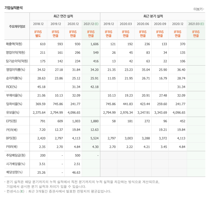 매출액 : 2017년 411억원, 2018년 610억원, 2019년 593억원, 2020년 930억원으로 2020년은 전년동기 56.8%증가하였습니다. 2020년 분기별로 보면, 1분기 45억원, 2분기 83억원, 3분기 34억원, 4분기 135억원입니다.