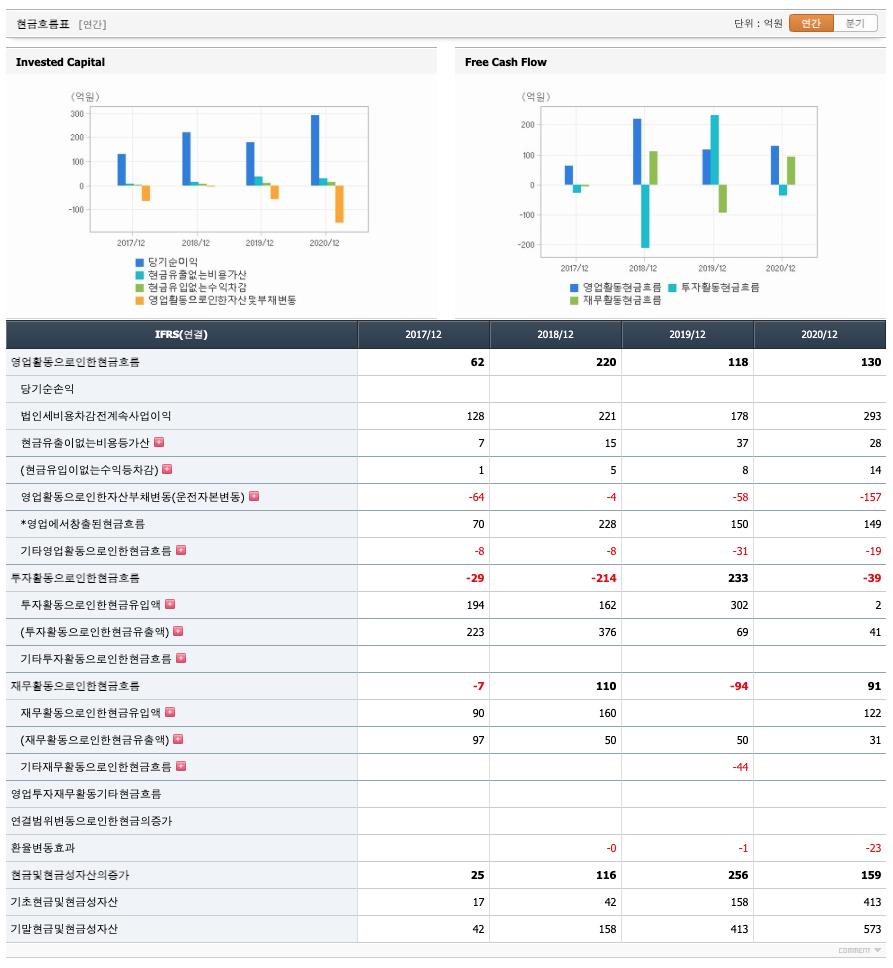 영업활동 현금흐름 : 2017년 62억원, 2018년 220억원, 2019년 118억원, 2020년 130억원으로 영업활동 현금흐름이 좋습니다.