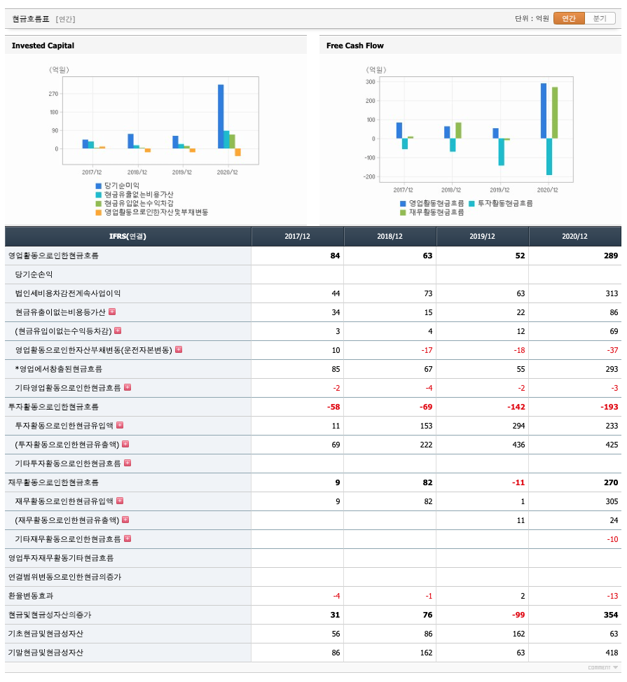 투자활동 현금흐름 : 2017년 -58억원, 2018년 -69억원, 2019년 -142억원, 2020년 193억원으로 투자활동 현금흐름이 좋습니다.