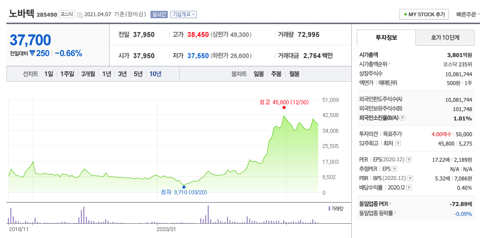 **매매포인트 : 노바텍은 20년 10월부터 상승하여 12월에 45800원을 찍고 조정 및 보합중입니다. 매수적정가는 35000원이하입니다.