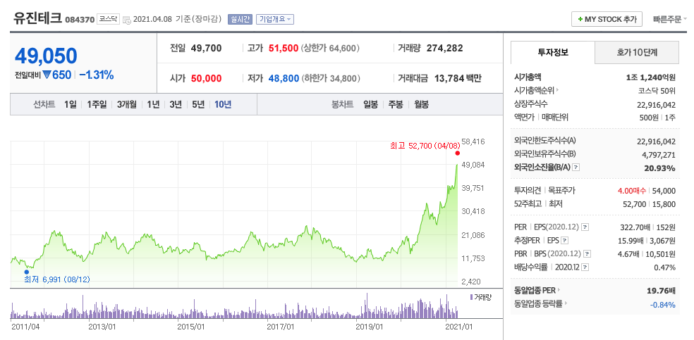유진테크의 2021년 영업이익은 895억원으로 추정됩니다. 현재(21.4.8) 시가총액은 1조 1240억원으로 멀티플은 12입니다. 목표주가는 56,000원입니다.