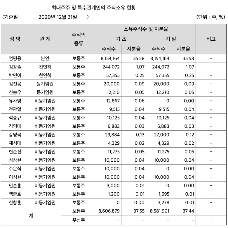 당사의 최대주주인 엄평용 대표이사는 광운대학교 응용전자공학과를 졸업하고 하이닉스반도체(구 현대전자산업) 반도체 사업부에서 DRAM개발, Brooks Automation Canada에서 세계 유수한 반도체 장비 회사의 Consulting 등을 거치면서 반도체 장비에 대한 전문 지식을 갖추게 되었습니다. 당기말 현재 당사의 최대주주등(특수관계인 포함)은 총 발행주식의 총 37.44%를 보유하고 있습니다.