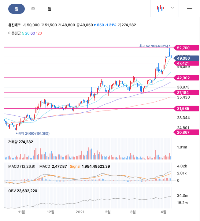 **매매포인트 : 유진테크는 20년 10월부터 증가하여 4월 52700원을 찍었습니다. 매수 적정가는 40,000원이하입니다.