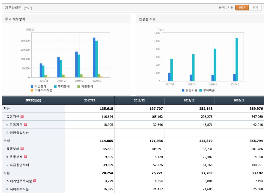 자산은 2017년 135618억원, 2018년 197707억원, 2019년 252148억원, 2020년 389976억원으로 증가하고 있습니다.