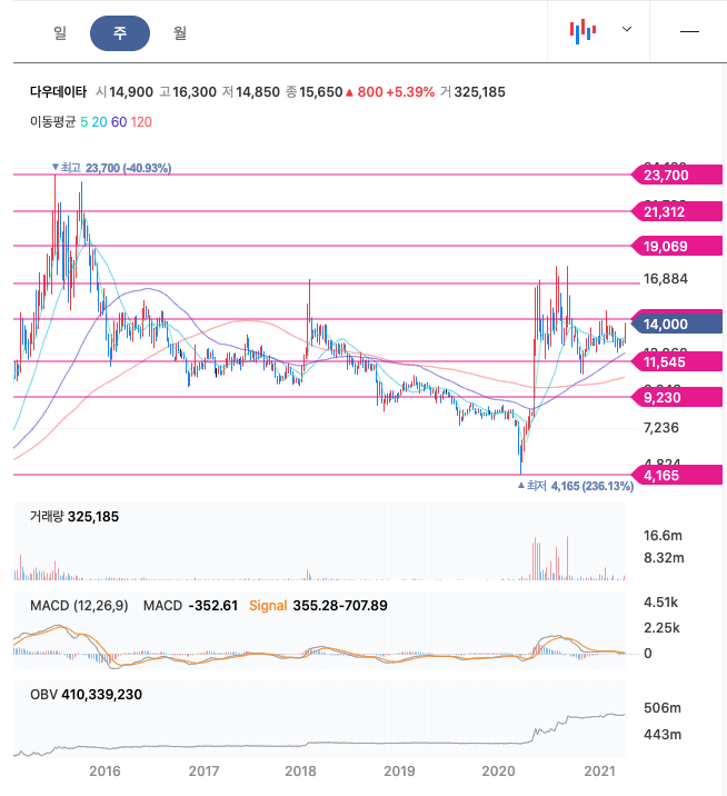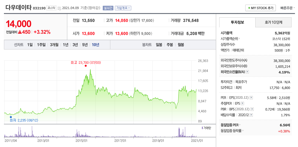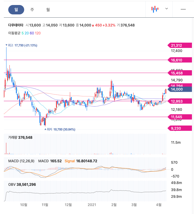 **매매포인트 : 다우데이타는 20년 5월 급등하여 20년 9월 최고점 17750원을 찍은 뒤, 조정을 받고 나서 보합상태입니다. 매수적정가는 13000원이하입니다.
