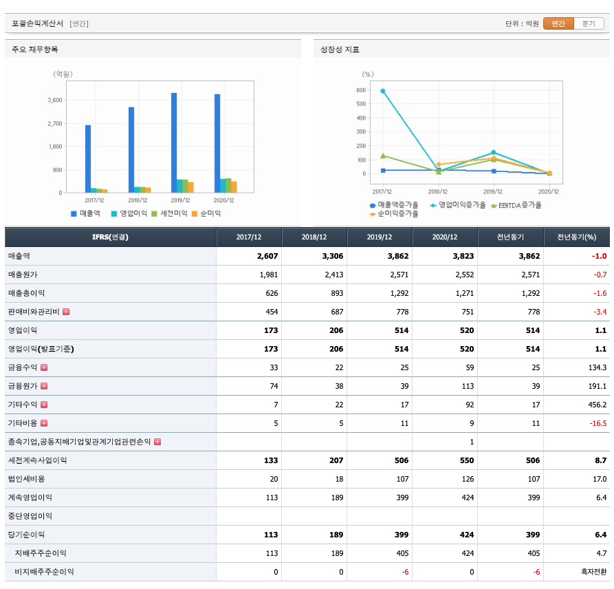 매출액 : 2017년 2607억원, 2018년 3306억원, 2019년 3862억원, 2020년 3823억원으로 증가추세이고, 2020년은 전년동기에 비해 -1% 감소하였습니다. 2020년 분기별로 보면 1분기 964억원, 2분기 892억원, 3분기 1069억원, 4분기 898억원입니다.