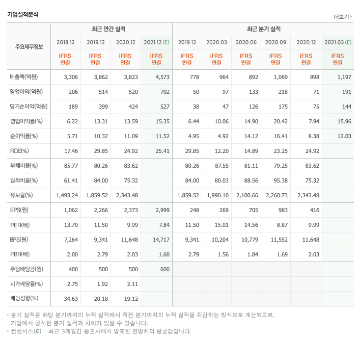 CAPEX : 2018년 104억원, 2019년 221억원, 2020년 524억원으로 CAPEX가 안정적이며, 2021년은 173억원으로 추정합니다.