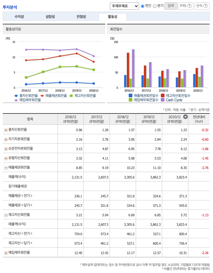 재고자산회전율 : 2018년 527억원, 2019년 600억원, 2020년 736억원이고, 회전율은 2018년 6회, 2019년 6회, 2020년 5회로 안정적입니다.