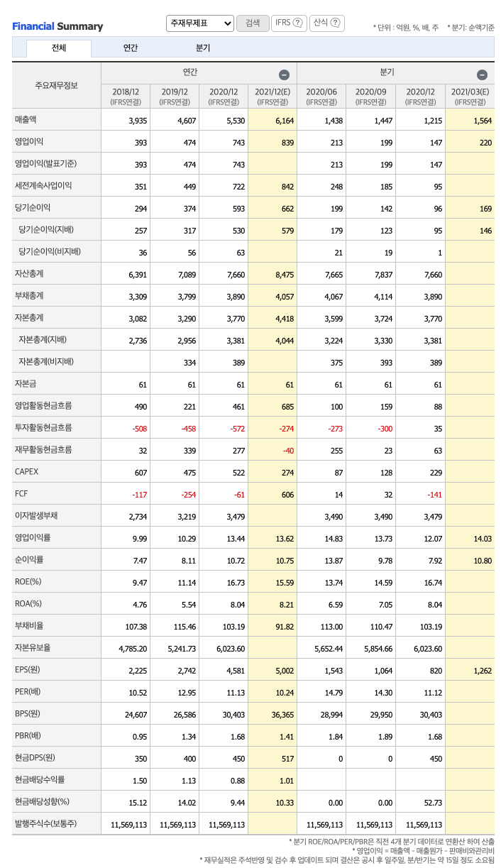 CAPEX : 2018년 607억원, 2019년 475억원, 2020년 522억원으로 CAPEX가 좋고, 2021년 예상치는 274억원입니다.